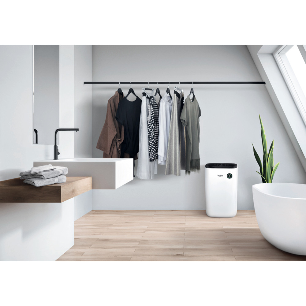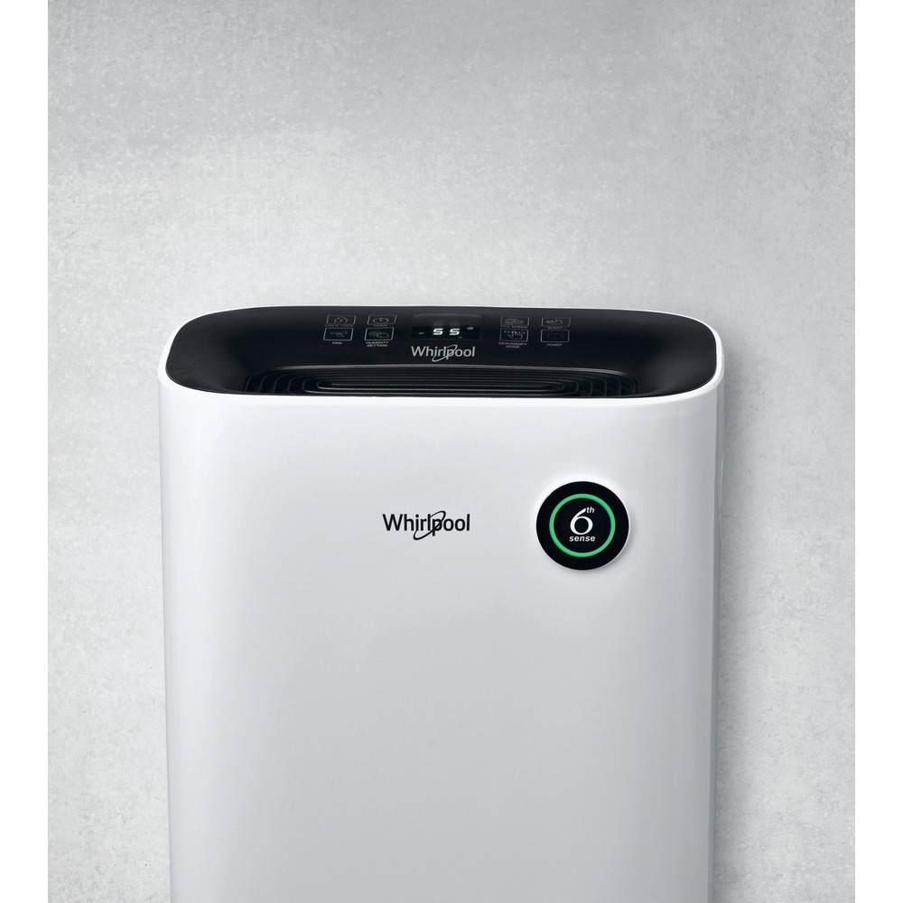 A WHIRLPOOL DE20W5252 TOUCH DISPLAY páramentesítő legfontosabb tulajdonságai: • 4 program: normális, folyamatos, 6. érzék és ruhaszárítási program. • 60 perc alatt akár 30%-kal csökkenti a helyiség páratartalmát. • 50%-kal csökkenti a ruhaneműk szárítási idejét (szárítási programmal). A 6. Érzék programnak köszönhetően automatikusan beállítja az Ön számára megfelelő páratartalmat minden évszakban. Nyáron ez segíthet abban, hogy nagyon meleg időben is kellemes legyen a beltéri klíma, télen pedig gondoskodik az optimális páratartalomról, megakadályozva a falak vizesedését. A nagyméretű víztartály (6,5 liter) praktikus, így csak ritkábban kell kiüríteni. A többszínű led-lámpa segíti az egyszerű használatához, valamint a páratartalmat vizuálisan is kiemeli: kék (<50%), zöld (50-70%), piros (> 70%) • Érintőképernyővel könnyű a beállítása • Modern, kompakt és exkluzív kialakítású. • Könnyen mozgatható az alsó kerekeknek köszönhetően. • Rendkívül környezetbarát.