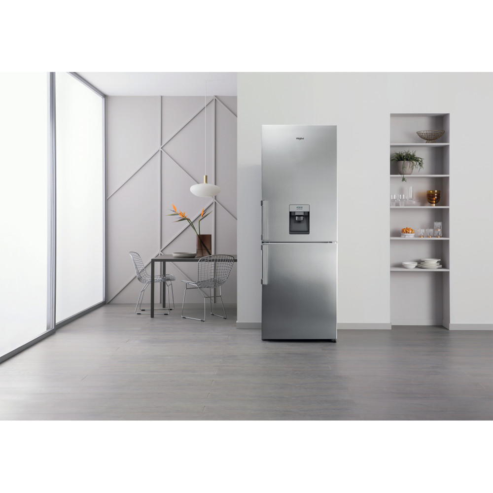 Whirlpool szabadonálló hűtő-fagyasztó jellemzők: inox szín. Optic Inox design ujjlenyomat elleni védelemmel. No frost, fagymentes technológia, amely hatékonyan megakadályozza a jég felhalmozódását a fagyasztóban a páratartalom csökkentésével. Egy magas készülék, amely megfelel a család igényeinek. Üveg polcok profil fronttal, mely robosztusságot, eleganciát, és extra biztonságot nyújtanak. Alulfagyasztós NoFrost hűtőszekrény, E energiaosztály, 304 (hűtőtér) + 153 (fagyasztótér) liter hasznos térfogat, inox készülékszín, 6. Érzék funkció (automatikus hőmérséklet szabályozás) elektronikus hőmérséklet beállítás belső LED-es kijelzővel, Starlight LED világítás, 0° rekesz, kihúzható frissentartó rekesz, NoFrost (jegesedésmentes) rendszer a fagyasztóban, multiflow teljes légáramlás, palacktartó, jégkocka készítő, vízadagoló, 40 dB, 1950x700x755mm 15 ÉV GARANCIA A KOMPRESSZORRA