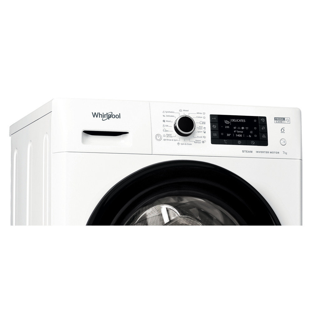 Whirlpool szabadonálló mosógép jellemzői: fehér szín. Tágas, 7,0kg-os kapacitás. Gyors, erőforrás-hatékony 1200 fordulat / perc centrifugálási sebesség. Exkluzív 6. Érzék technológia, amely dinamikusan alkalmazkodik a beállításokhoz minden egyes terhelésnél, biztosítva az összes ruhanemű megfelelő kezelését. 30 perces gyors mosás.